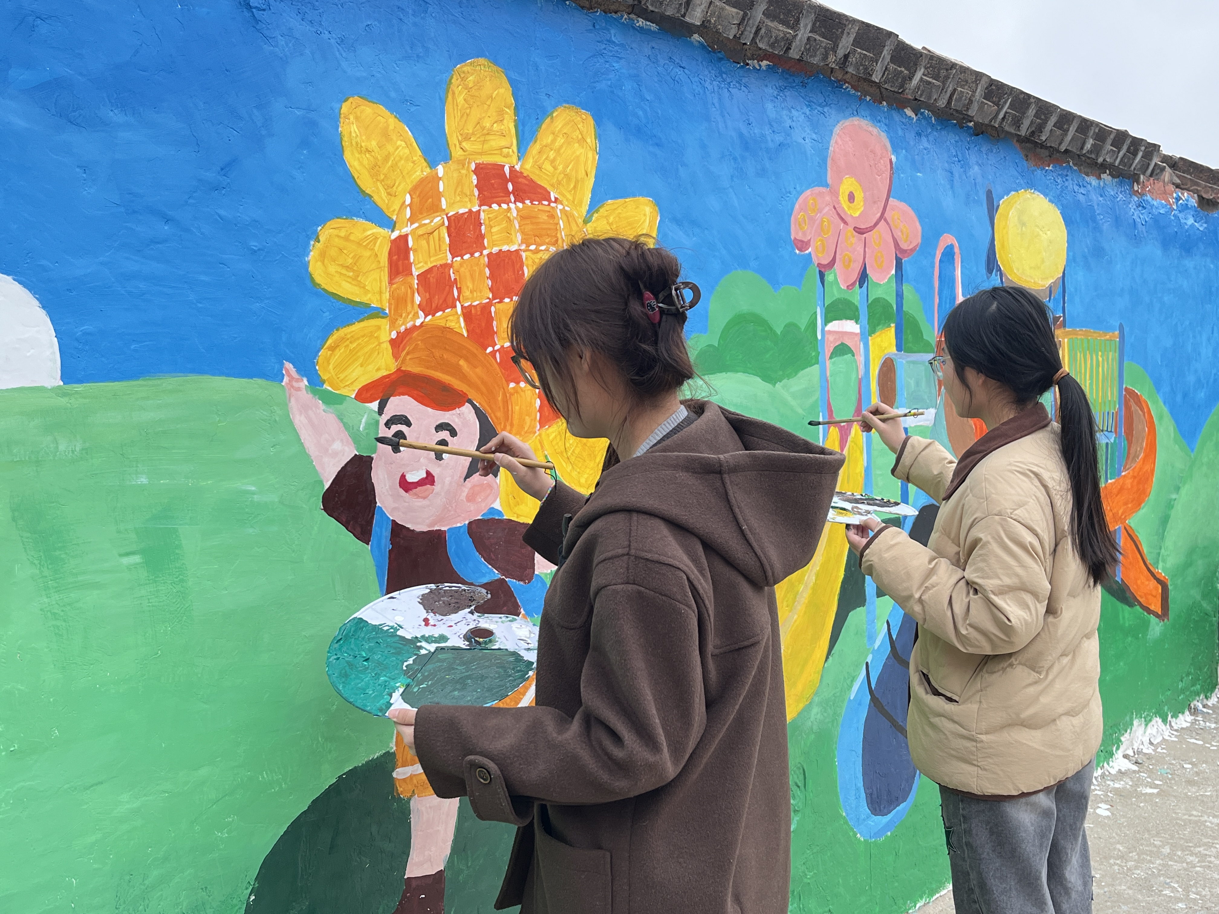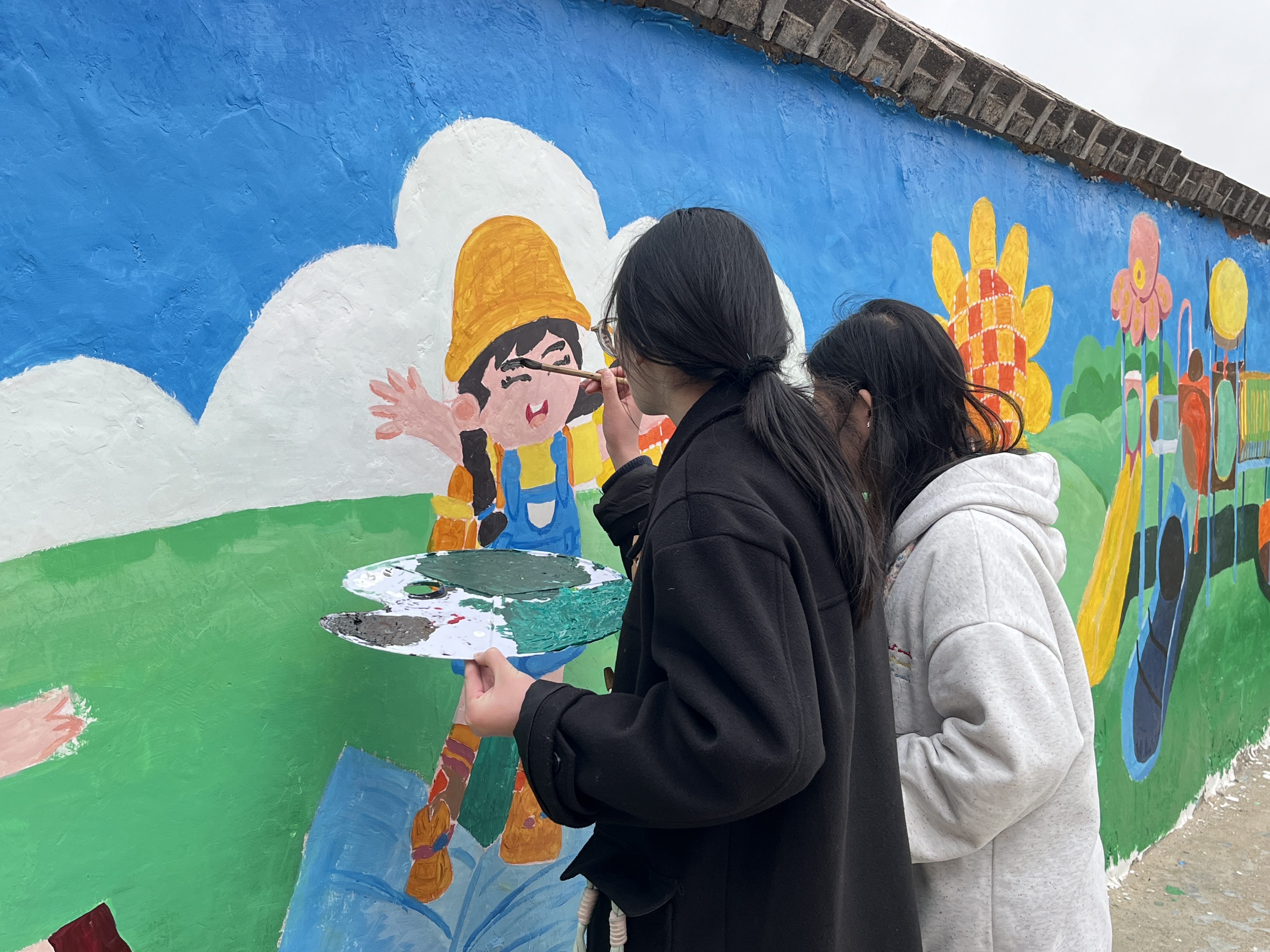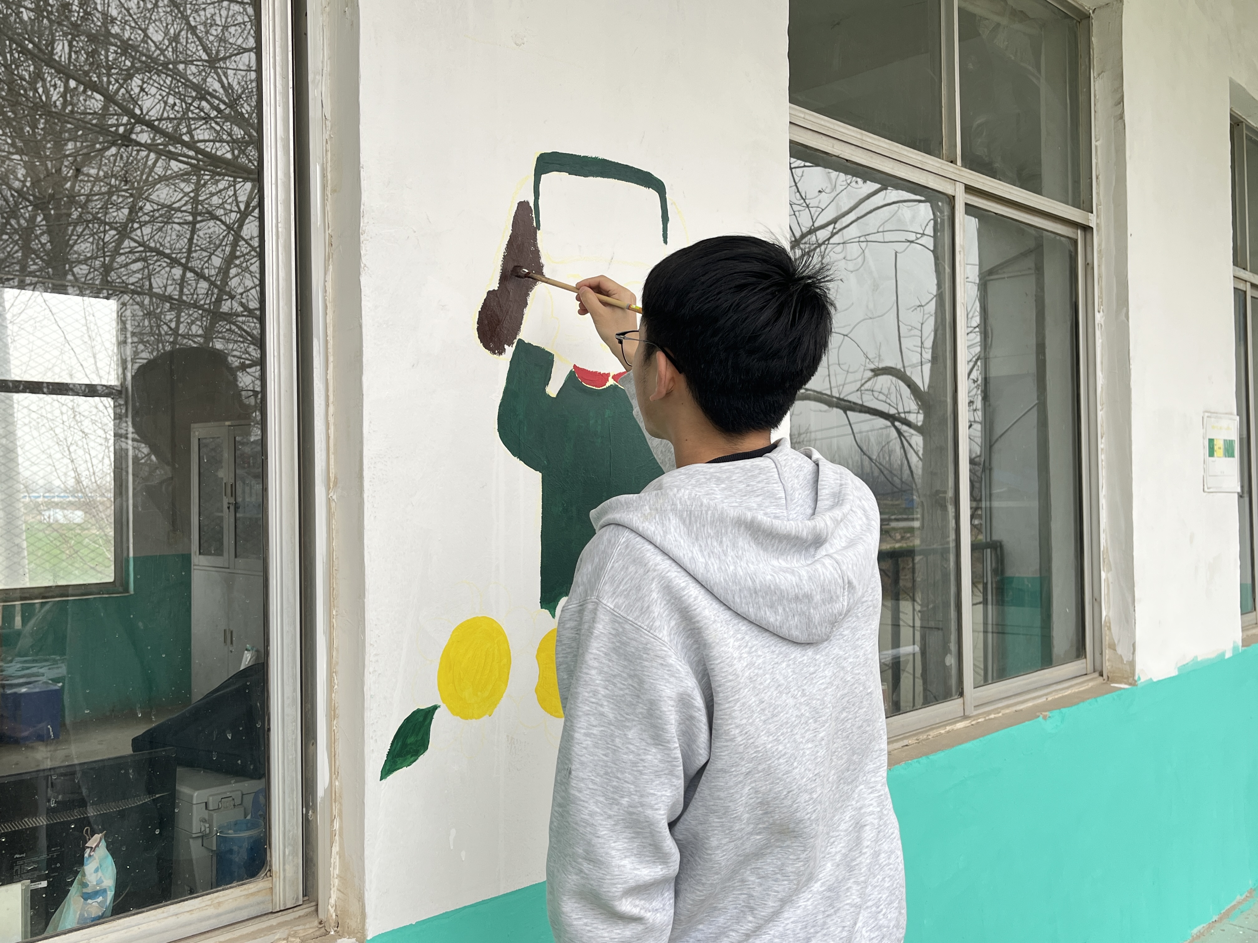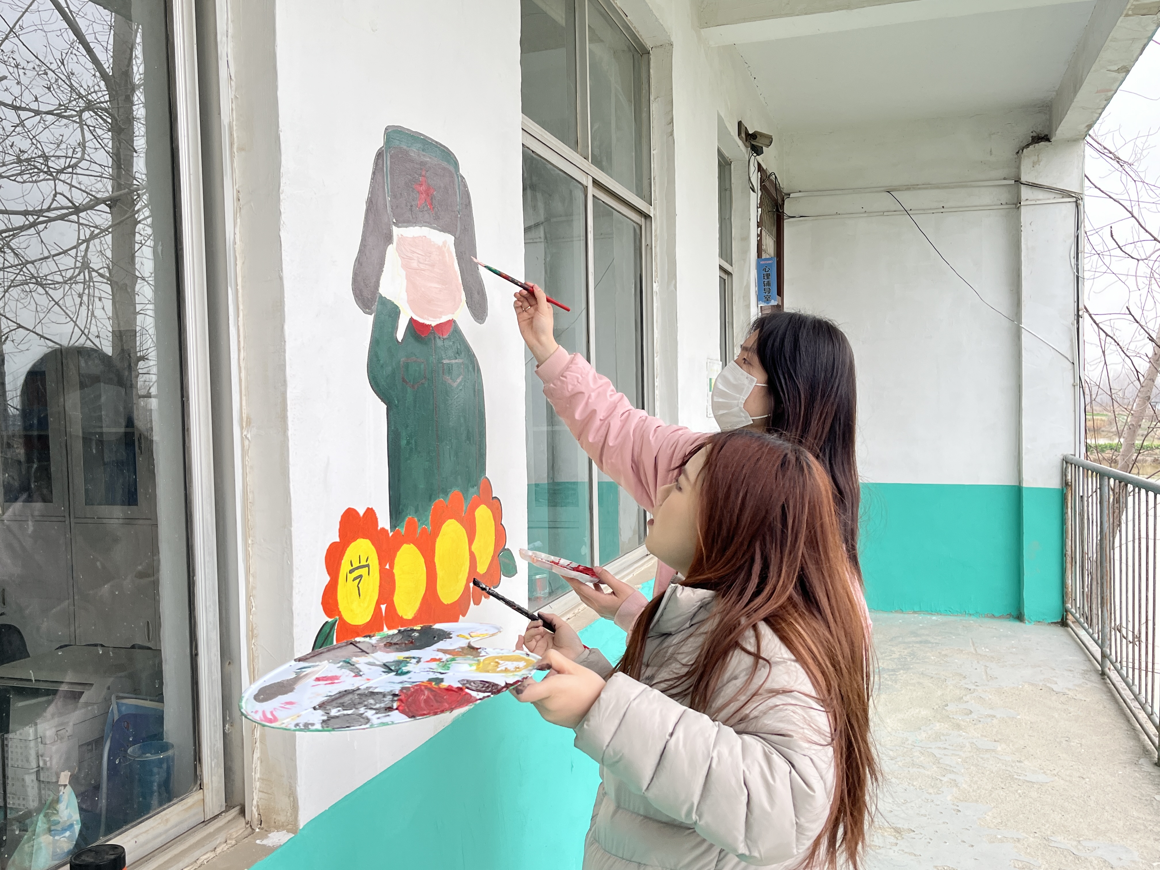 学雷锋,妙笔添彩绘校园。在校园门口,学生党员们充分发挥小学教育专业专长,志愿为田庄小学精心绘就七彩墙绘。大家手持画笔、颜料等工具,以饱满的热情投入墙绘创作中。