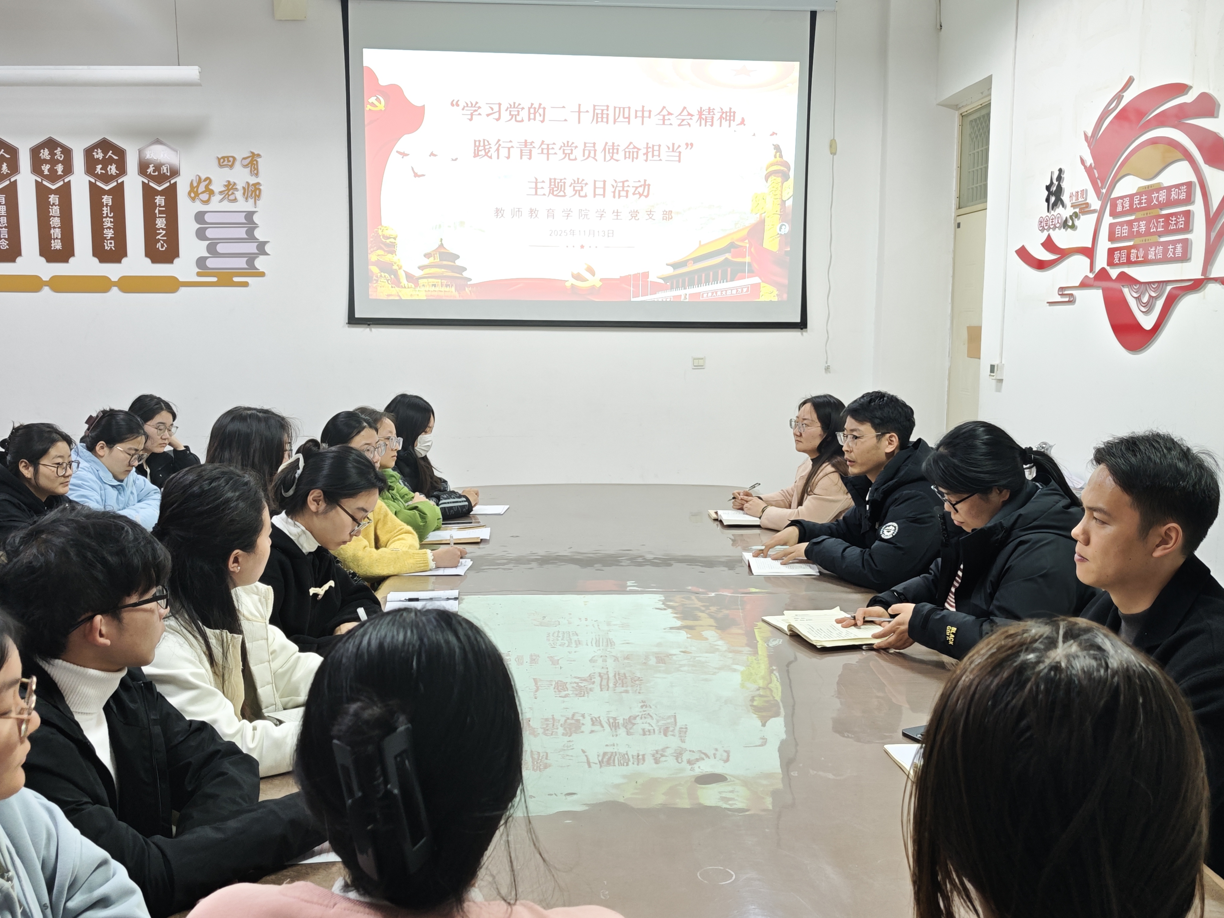 11月13日,beat365在线唯一官网学生党支部在汉梁楼203教室开展“学习党的二十届四中全会精神 践行青年党员使命担当”主题党日活动。学生第二党支部书记张旖旎主持会议。