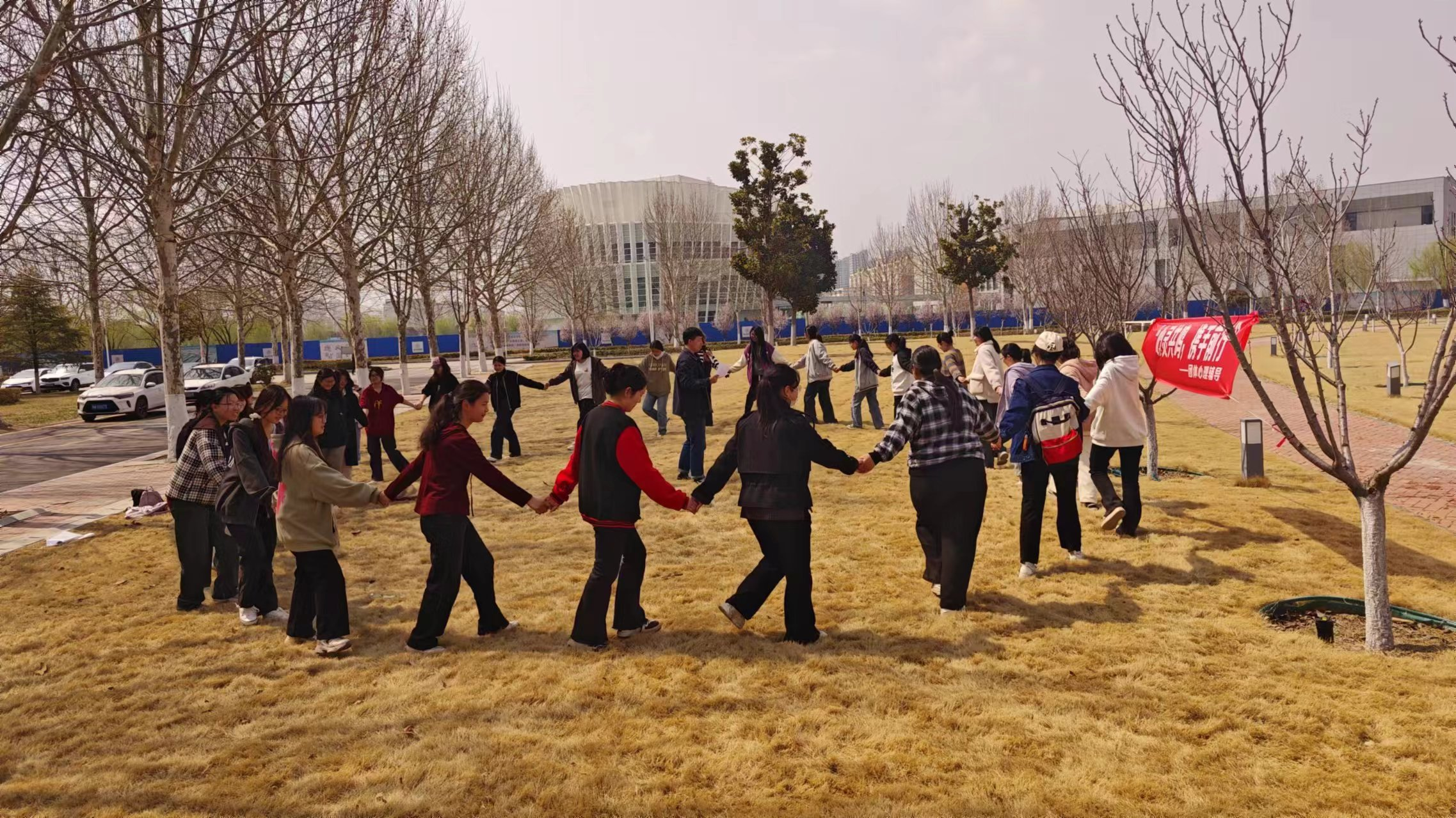 为营造安全文明和谐的校园氛围,提高学生心理健康素养,增强沟通协作能力,3月22日,大学生心理协会在汉梁楼北侧草坪举办“心灵共鸣,携手前行”的团体心理辅导活动。
