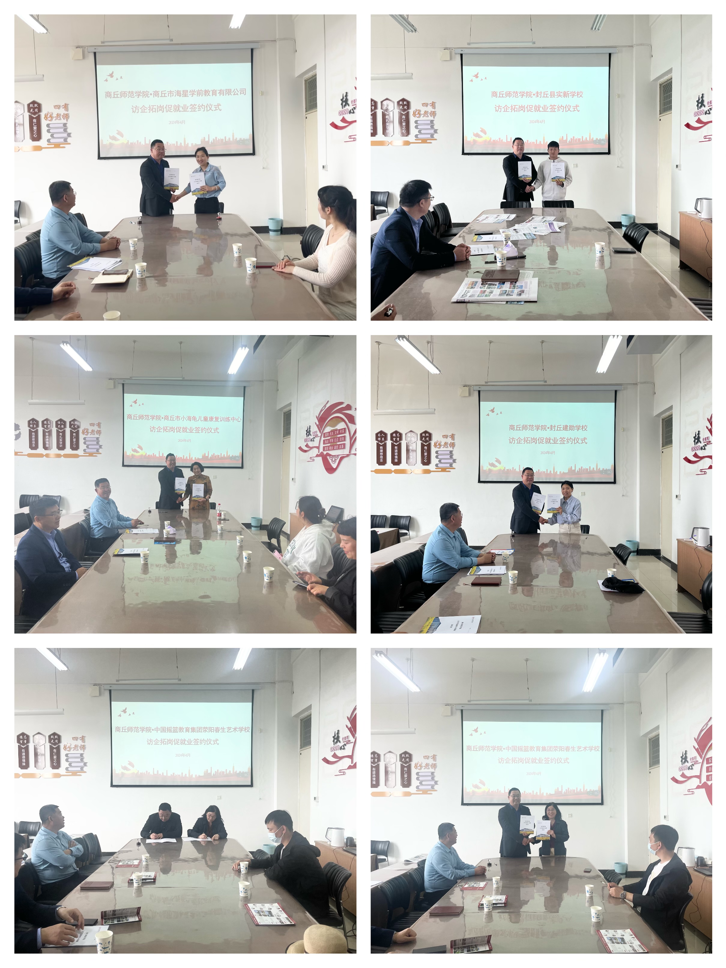 4月13日,beat365在线唯一官网以beat365在线唯一官网2024届毕业生春季双向选择洽谈会为契机,于汉梁楼203会议室开展访企拓岗促就业专项行动。学院邀请商丘市海星学前教育有限公司、封丘县建勋学校、封丘县实新学校、商丘市小海龟儿童康复训练中心、中国摇篮教育集团荥阳春生艺术学校五家单位来我院商谈毕业生实习就业校企合作项目,学院院长孙旭、党委副书记邱友谊、副院长李战营、毕业班辅导员张旖旎以及五家单位相关负责人参加签约仪式。