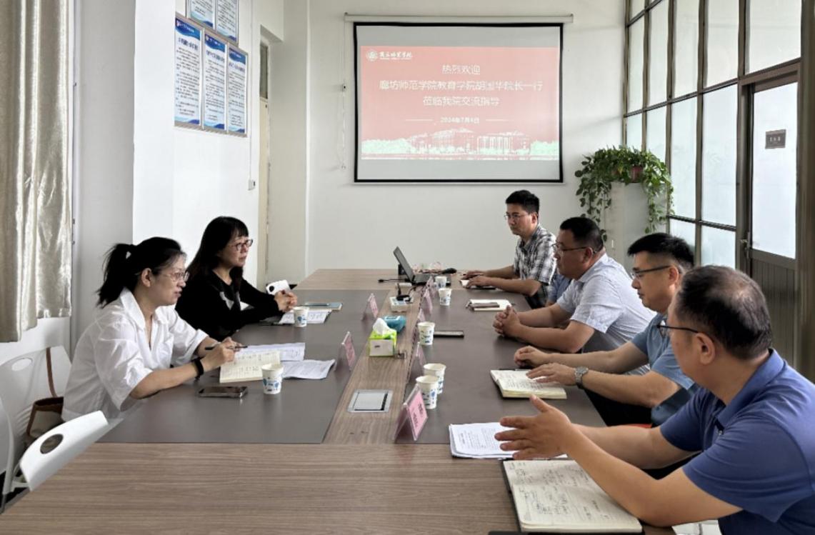 7月4日上午,廊坊师范学院教育学院副院长胡国华一行莅临我院考察交流。beat365在线唯一官网院长孙旭,副院长李战营、刘海军,教育学系主任徐林,实验室主任丁楠热情接待客人并参加座谈。