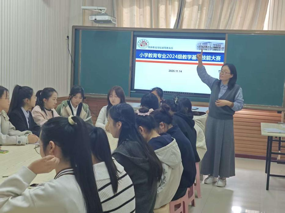 为提升和展示我专业师范生专业素养和师范技能,展现师范生风采,2025年11月14日,初等教育系举办了2024年级师范生教学基本功竞赛。本次竞赛旨在全面提升本专业师范生的专业素养和实践能力,来自2024级小学教育专业的22名选手参加了比赛。