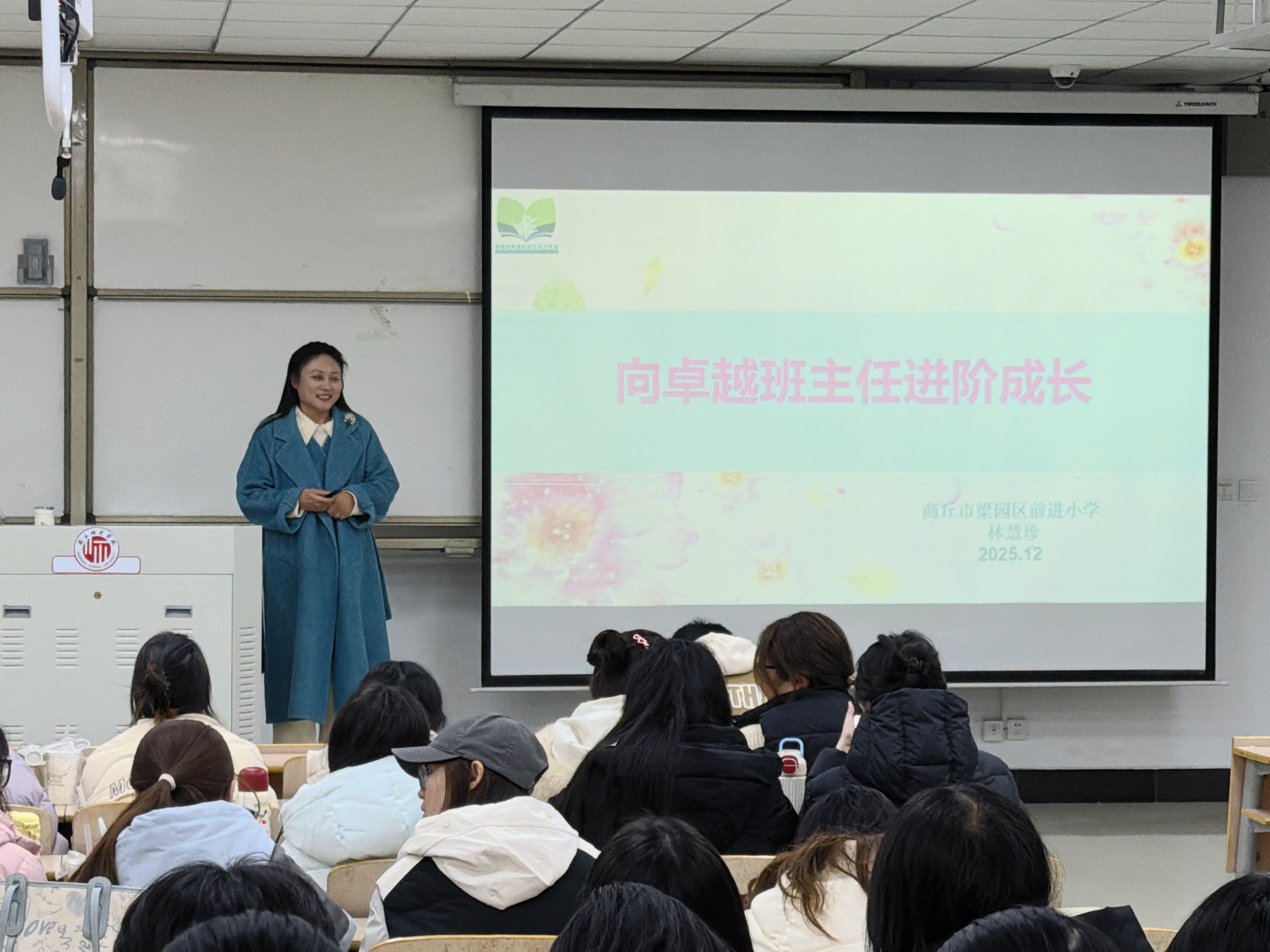 12月15日,河南省师范教育质量提升行动计划师范生成长工作坊示范性项目小学教育师范生成长工作坊在行方楼218教室开展《向卓越班主任进阶》专题讲座。讲座旨在分享班级管理方法与文化建设思路,提升班级管理效率与育人质量。主讲人是商丘市梁园区前进小学班主任、中原名班主任、河南省模范教师林慧珍,2023级小学教育专业全体学生参加讲座活动。